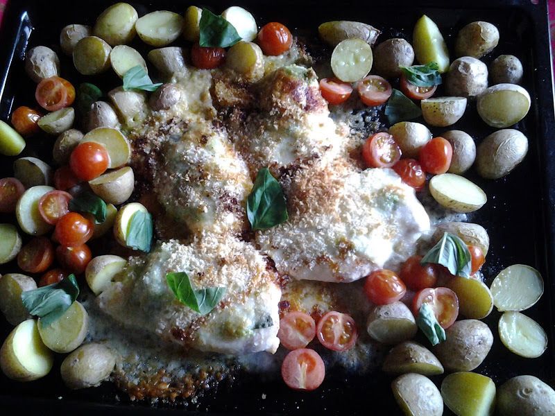 Sehr praktisch....alles auf einem Backblech und schnell fertig. Es hat uns wirklich sehr gut geschmeckt, aber pro Person ein Stück Hähnchenbrust waren doch schon sehr wenig. Es liegt sicher auch daran das wir "Fleischfresser" sind.
