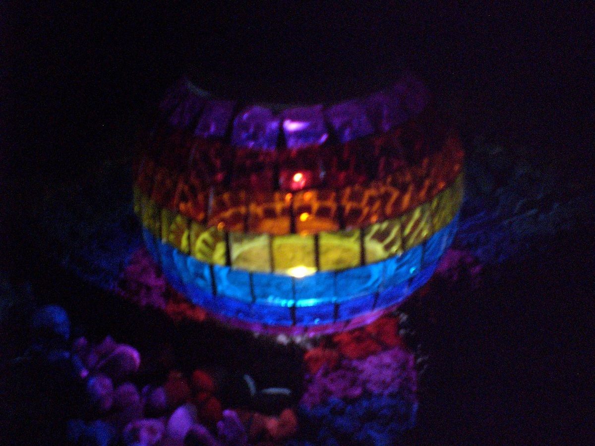 Zuerst muss die Solarzelle ein wenig aufladen. Wir habe sie nach draußen in die Sonne gestellt und am Abend konnten wir das Farbspiel dann bewundern.