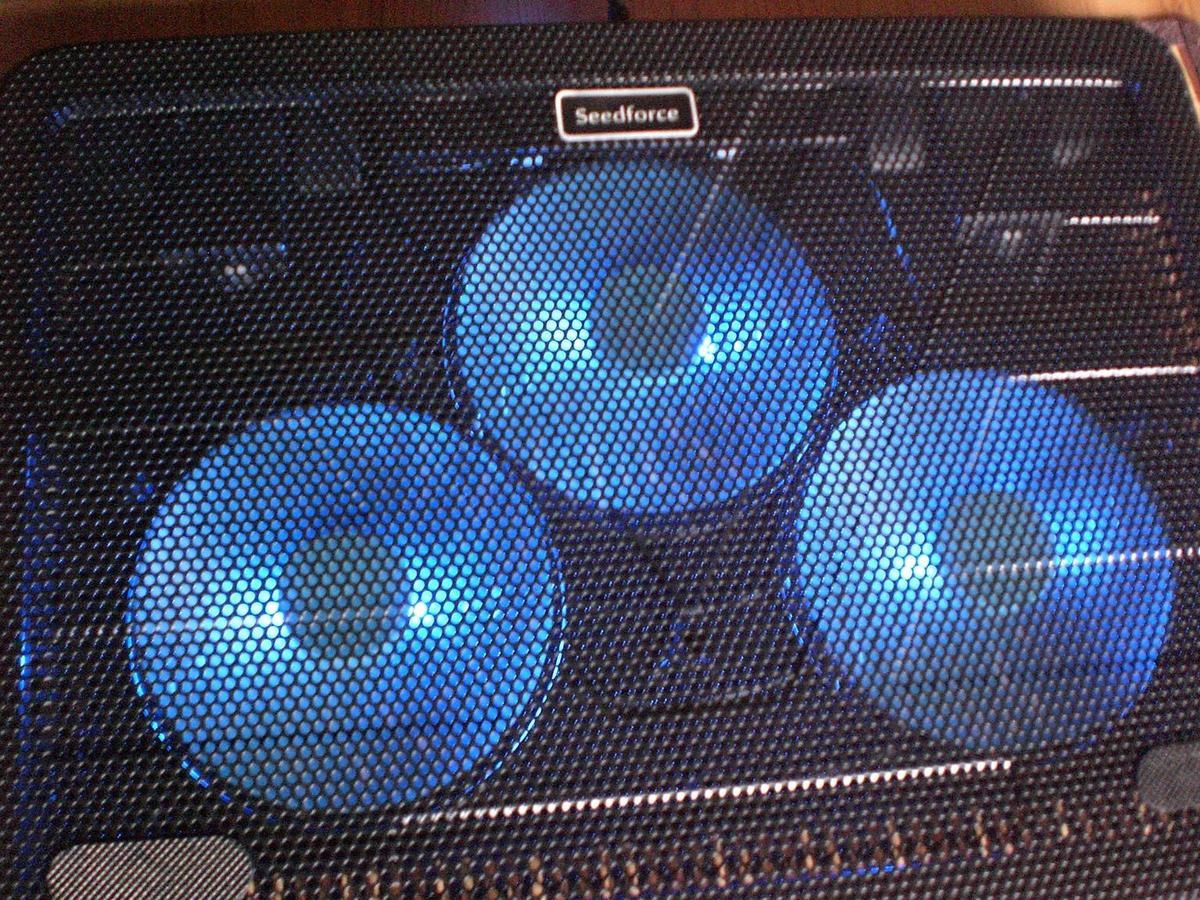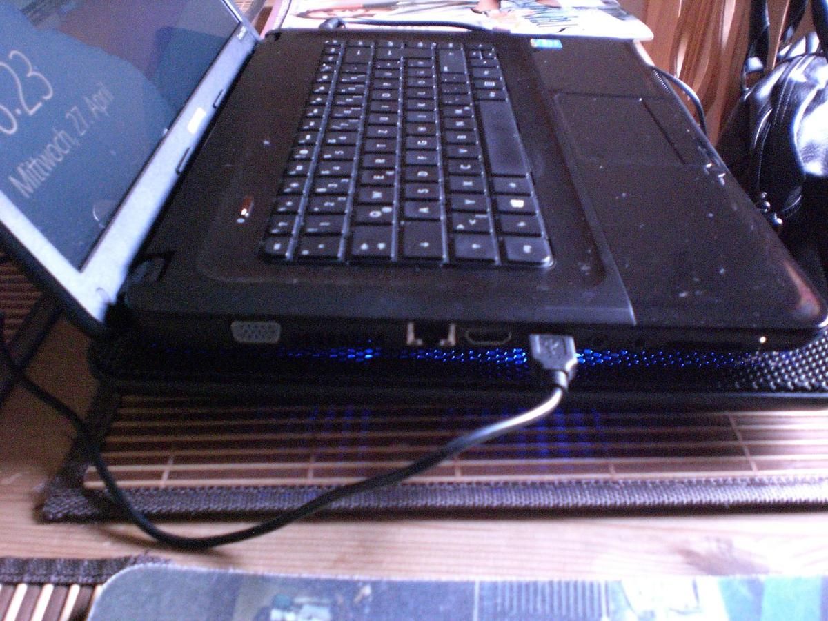 Der Kühler leuchtet nun in blau… irgendwie ganz toll anzuschauen… Auf jeden Fall kühlt das Ding so was von genial. Auch nach vielen Stunden ist mein Laptop gut gekühlt. Das Geräusch ist wie bei einem Ventilator… zu hören, aber wirklich nur ganz leicht und nicht störend.