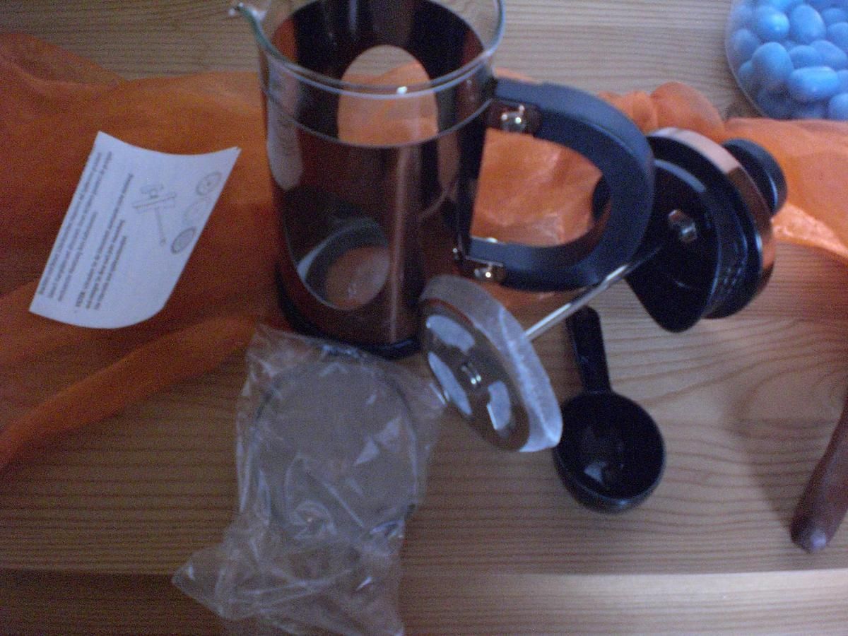 Da ich auch für die Kaffeefiltermaschine den Kaffee immer in der Kaffeemühle frisch mahle, habe ich mir ein paar Bohnen zurechtgemacht. Ich habe die Bohnen ein wenig gröber gelassen. Mit dem beiliegenden Kaffeelöffel kann man nun den gemahlenen Kaffee gut dosiert in die Kanne geben. Nun nur noch heißes Wasser aufgießen und gut umrühren.